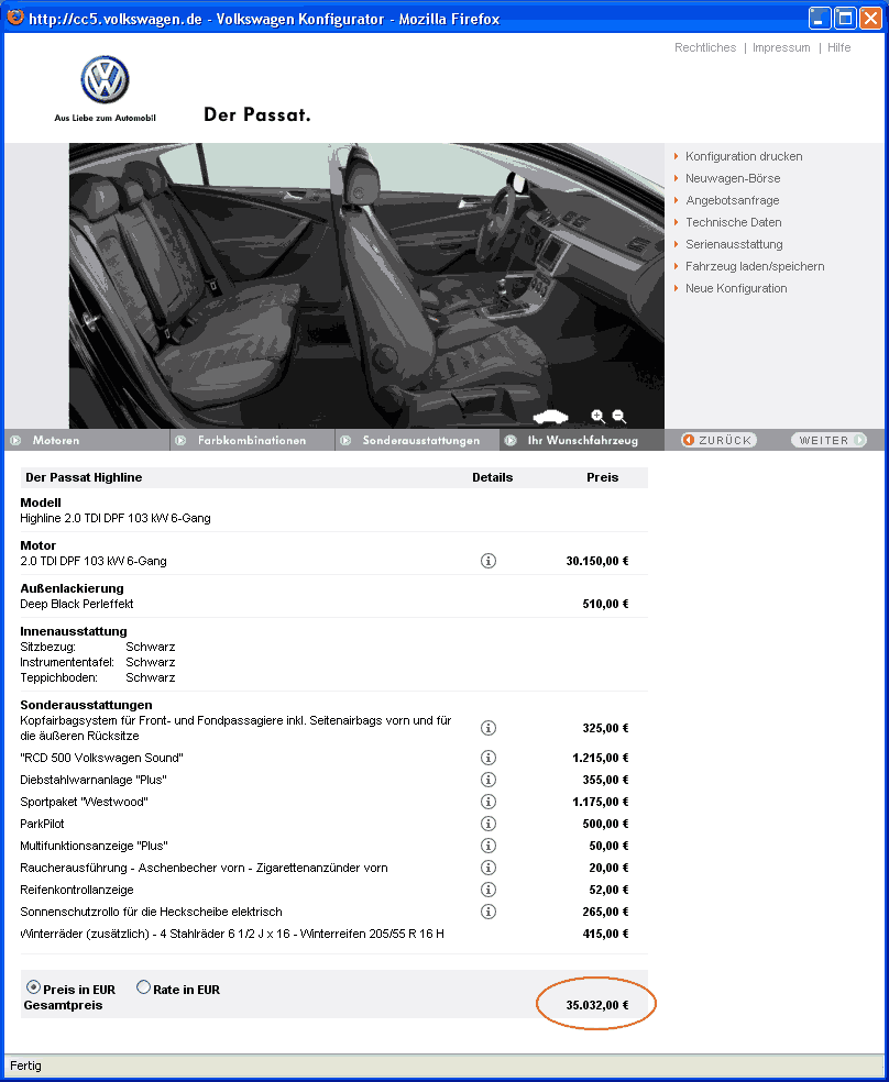 | 140-PS-Diesel-Motor mit einem Dieselpartikelfilter, 8 x Airbag (serienmäßig sind es nur 6), Climatronic, RCD 500 mit integriertem CD-Wechsler und Volkswagen Sound (250W, 10 Lautsprecher), ParkPilot, el. Sonnenschutzrollo für die Hechscheibe, 17"-Alus-Westwood (Bestandteil vom Sportpaket). Genaueres über die Fahrzeugausstattung erfahren Sie unter "Serienausstattung" und "Extras". |